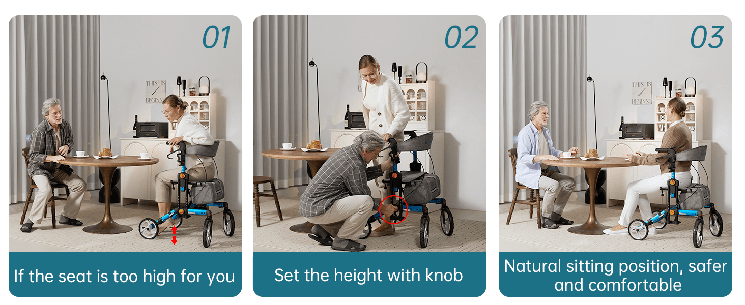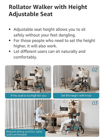 KLD-9282 Dual-Brake Knob Adjustment Height Rollator Walker 8" Rear Wheels